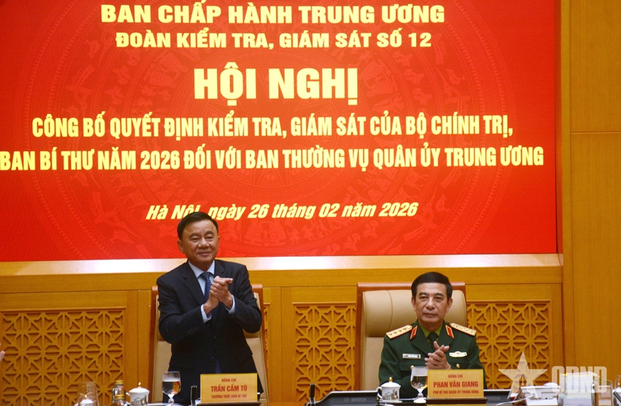 Chiều 26-2, tại Hà Nội, Đoàn kiểm tra, giám sát số 12 của Bộ Chính trị, Ban Bí thư tổ chức Hội nghị công bố quyết định kiểm tra, giám sát năm 2026 đối với Ban Thường vụ Quân ủy Trung ương. Đồng chí Trần Cẩm Tú, Ủy viên Bộ Chính trị, Thường trực Ban Bí thư, Trưởng đoàn kiểm tra, giám sát tham dự hội nghị...