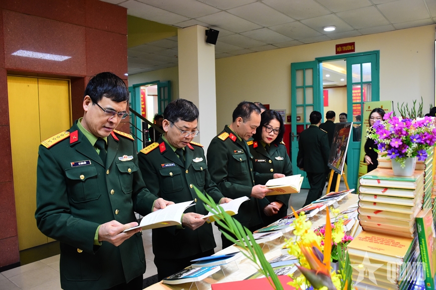 Các đại biểu tham quan trưng bày giới thiệu cuốn sách của Đại tướng Phan Văn Giang.