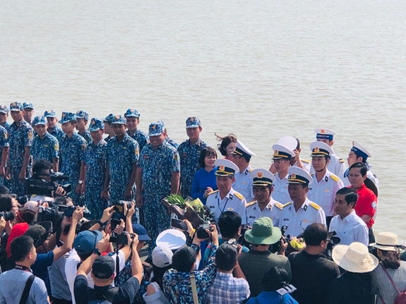Hai trưởng đoàn nhận hoa chúc mừng của Chuẩn đô đốc Phạm Khắc Lượng, Tư lệnh Vùng 2 Hải quân tại lễ tiễn.