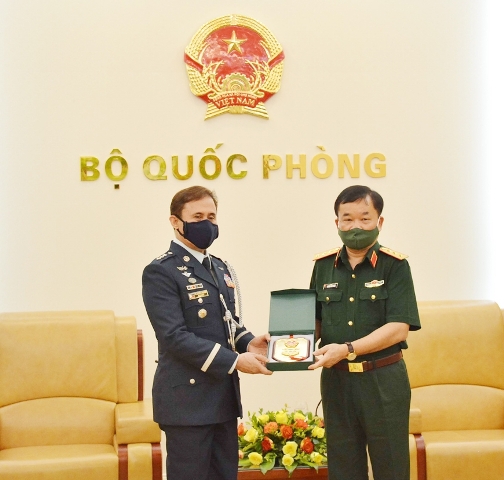 Thượng tướng Hoàng Xuân Chiến trao quà lưu niệm tặng Đại tá Ulysses S. Mancao.