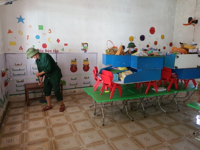 Cán bộ, chiến sĩ Ban CHQS huyện Quỳnh Lưu giúp Trường Mầm non Quỳnh Hồng khắc phục hậu quả sau lũ.