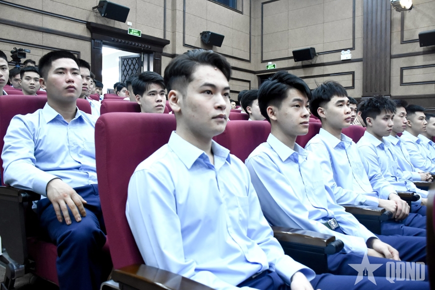 Các đồng chí hoàn thành nghĩa vụ quân sự chăm chú nghe những lời căn dặn của thủ trưởng Cơ quan Tổng cục Chính trị.