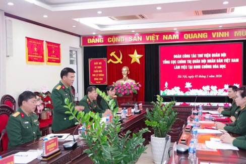 Chiều ngày 05/3/2026, Đoàn công tác Thư viện Quân đội, Tổng cục Chính trị do đồng chí Đại tá Mạc Thùy Dương, Giám đốc Thư viện Quân đội đã đến làm việc với Cục Chính trị về tình hình hoạt động thư viện sách, báo tại hệ thống Thư viện,phòng đọc trong Binh chủng và phối hợp công tác triển khai Dự án ‘Chuyển đối sốhệ thống thư viện trong Quân đội Nhân dân Việt Nam”.