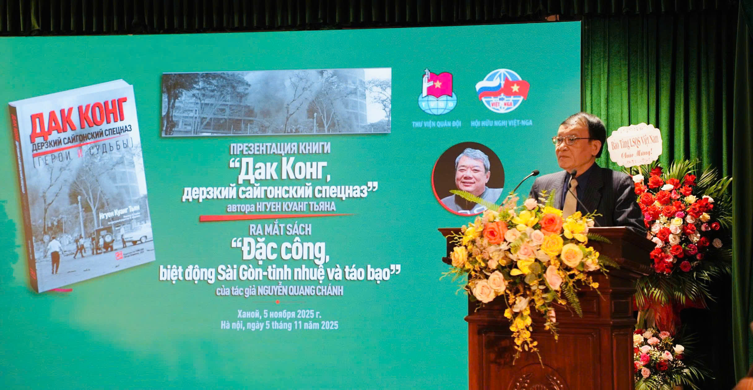 Ngày 5/11, tại Hà Nội, Thư viện Quân đội phối hợp với Hội Hữu nghị Việt – Nga tổ chức lễ ra mắt cuốn sách “Đặc công, biệt động Sài Gòn - tinh nhuệ và táo bạo” phiên bản tiếng Nga của nhà văn Nguyễn Quang Chánh. Đây là hoạt động ý nghĩa nằm trong chuỗi sự kiện chào mừng 75 năm thiết lập quan hệ ngoại giao Việt Nam - Liên bang Nga (1950 - 2025).
