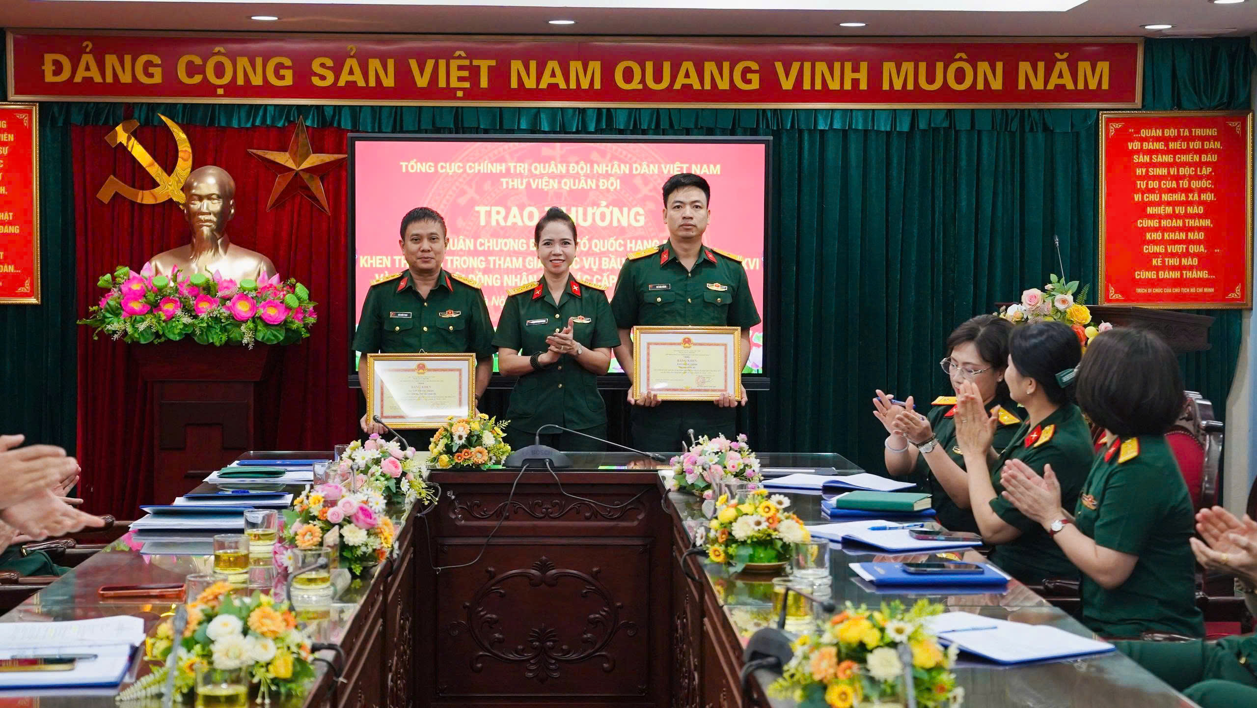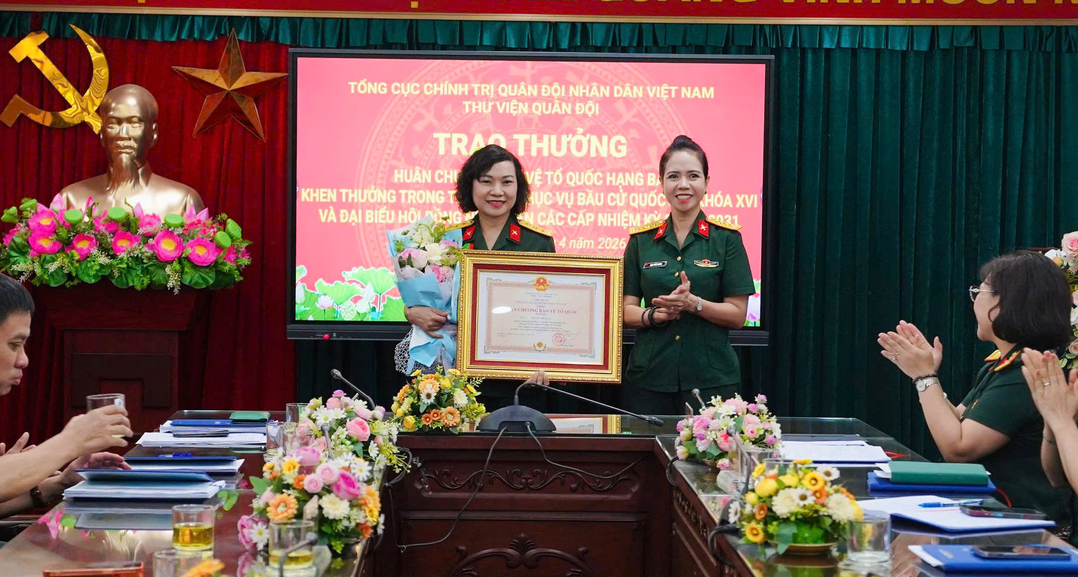 Cũng tại hội nghị, đơn vị đã tổ chức trao Huân chương Bảo vệ Tổ quốc hạng Ba cho Thượng tá Nguyễn Thúy Cúc, nguyên Trưởng phòng Phục vụ bạn đọc và Bằng khen của Chủ nhiệm Tổng cục Chính trị cho Đại tá Bùi Khắc Thạo, Phó Giám đốc Thư viện Quân đội; tập thể Ban Hành chính vì đã có thành tích xuất sắc trong tham gia phục vụ bầu cử đại biểu Quốc hội khóa XVI và đại biểu Hội đồng nhân dân các cấp nhiệm kỳ 2026–2031.