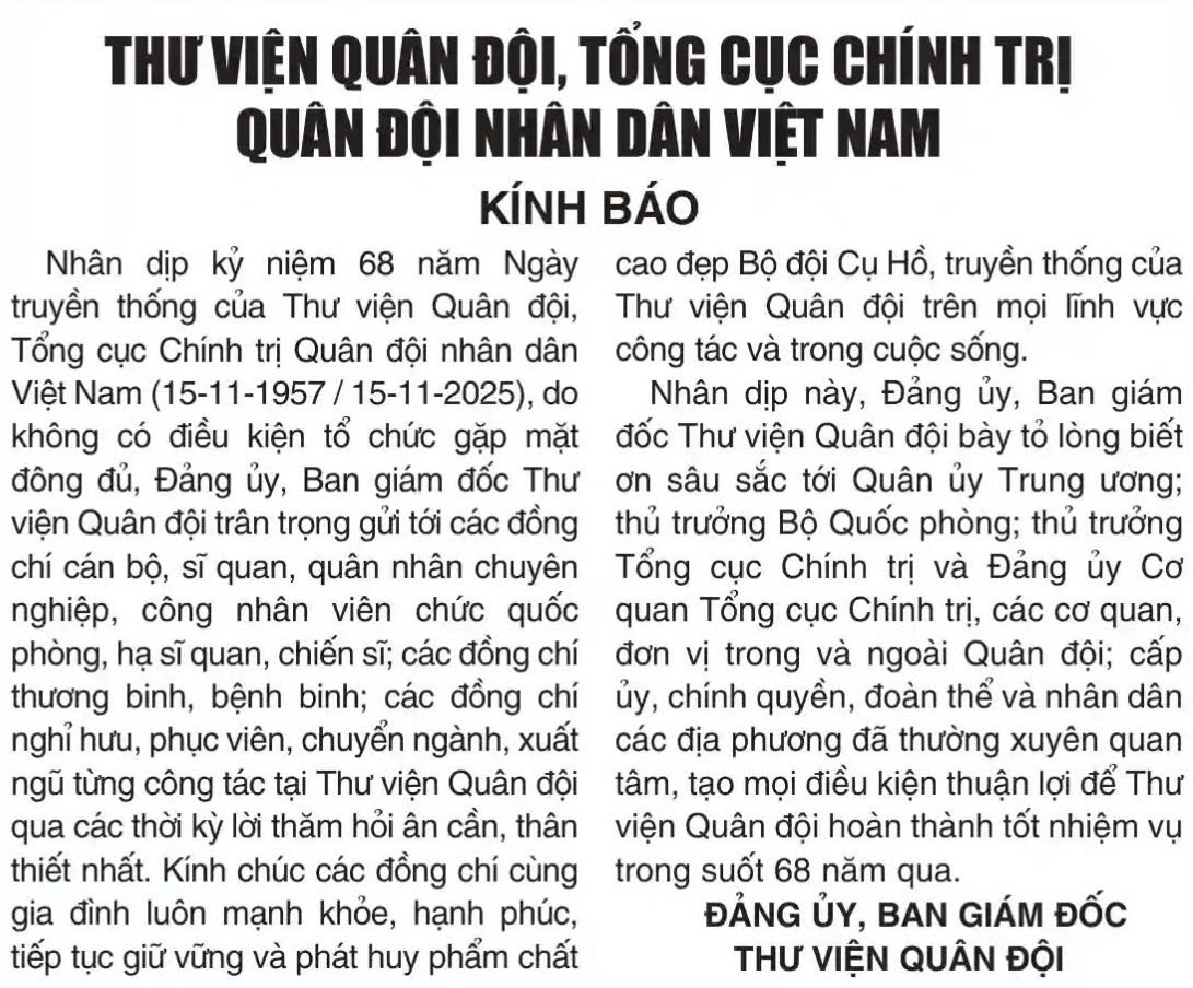 Thư Viện Quân đội Tổng cục Chính trị Quân đội nhân dân Việt Nam kính báo!
