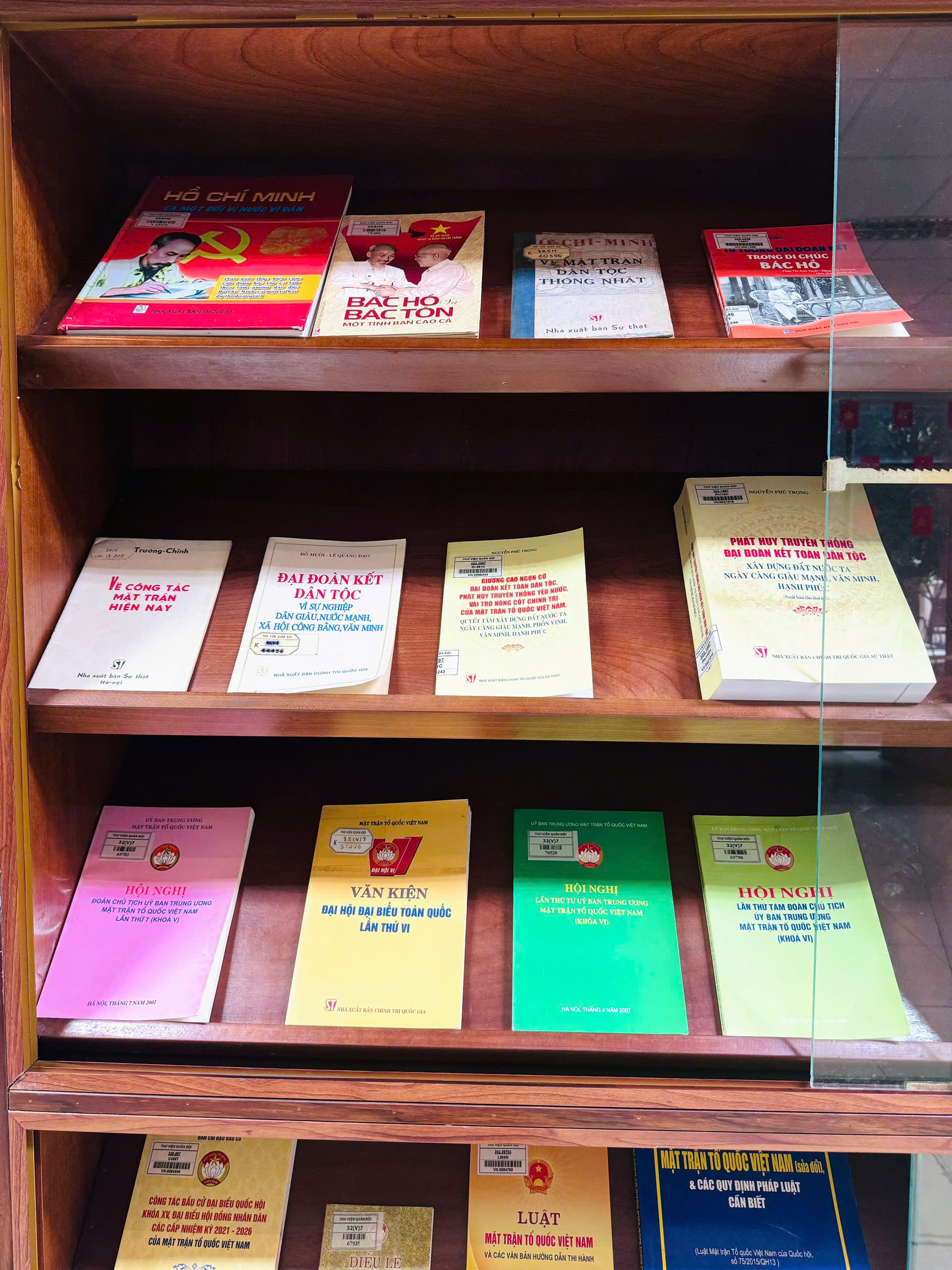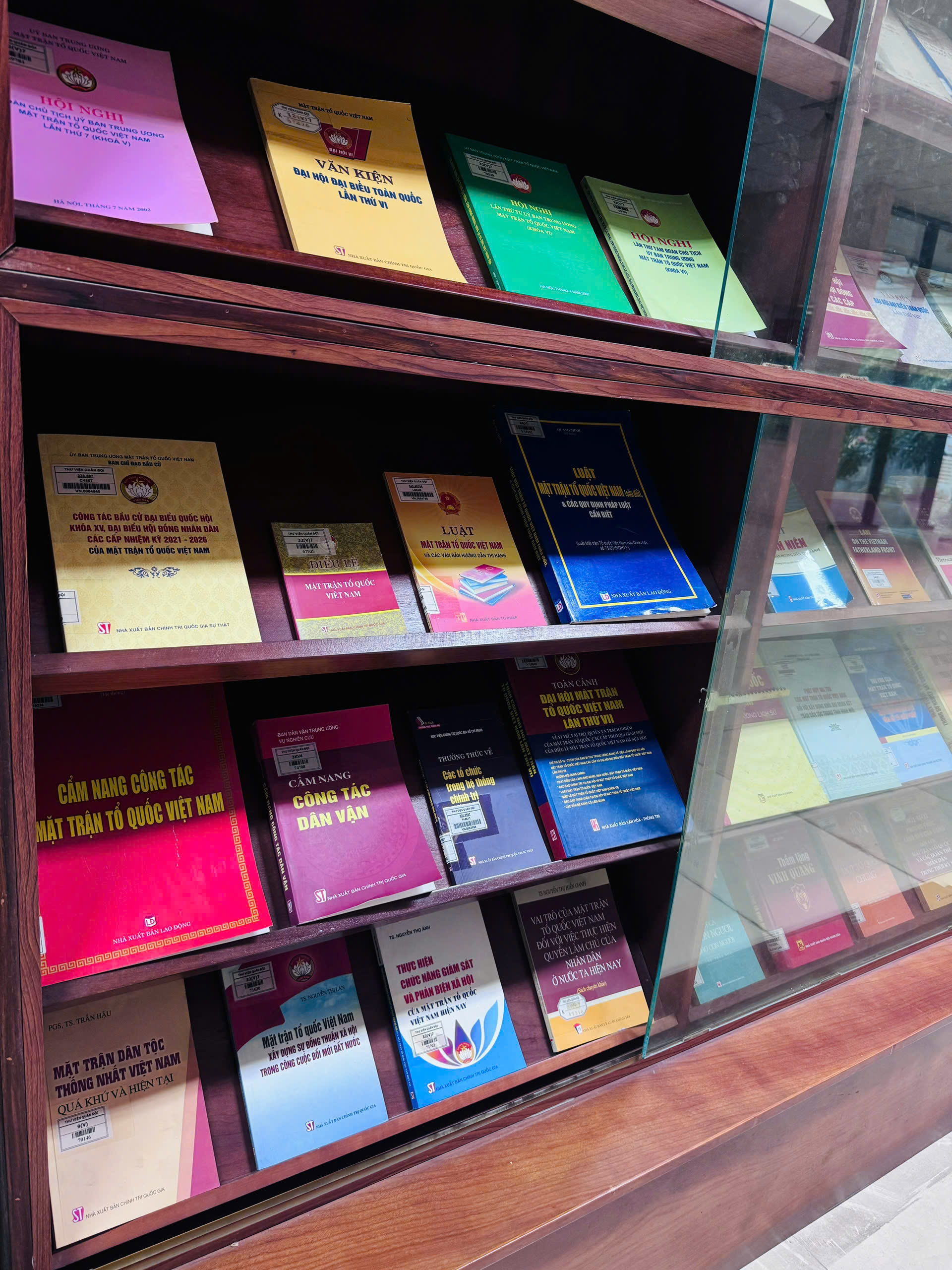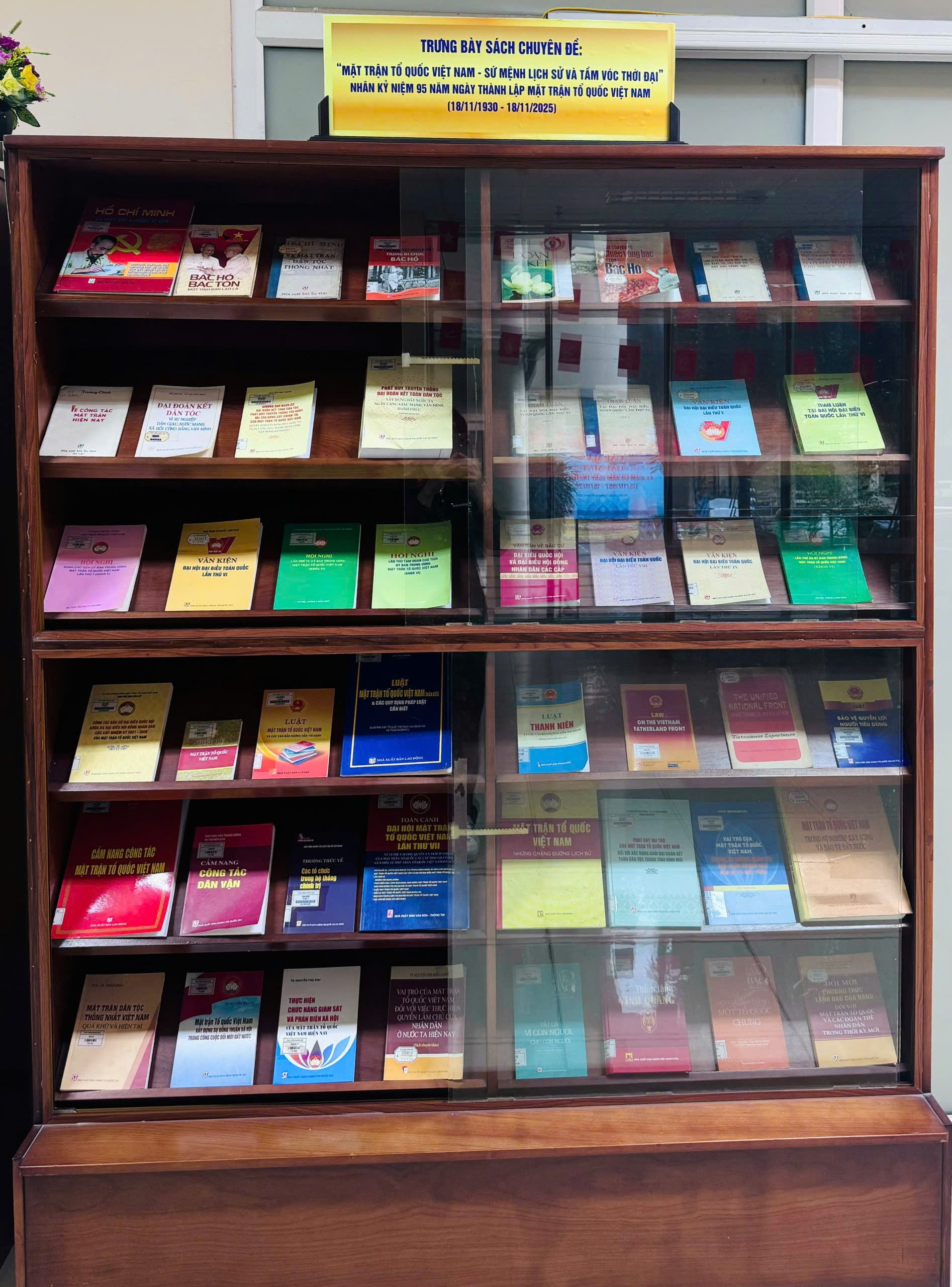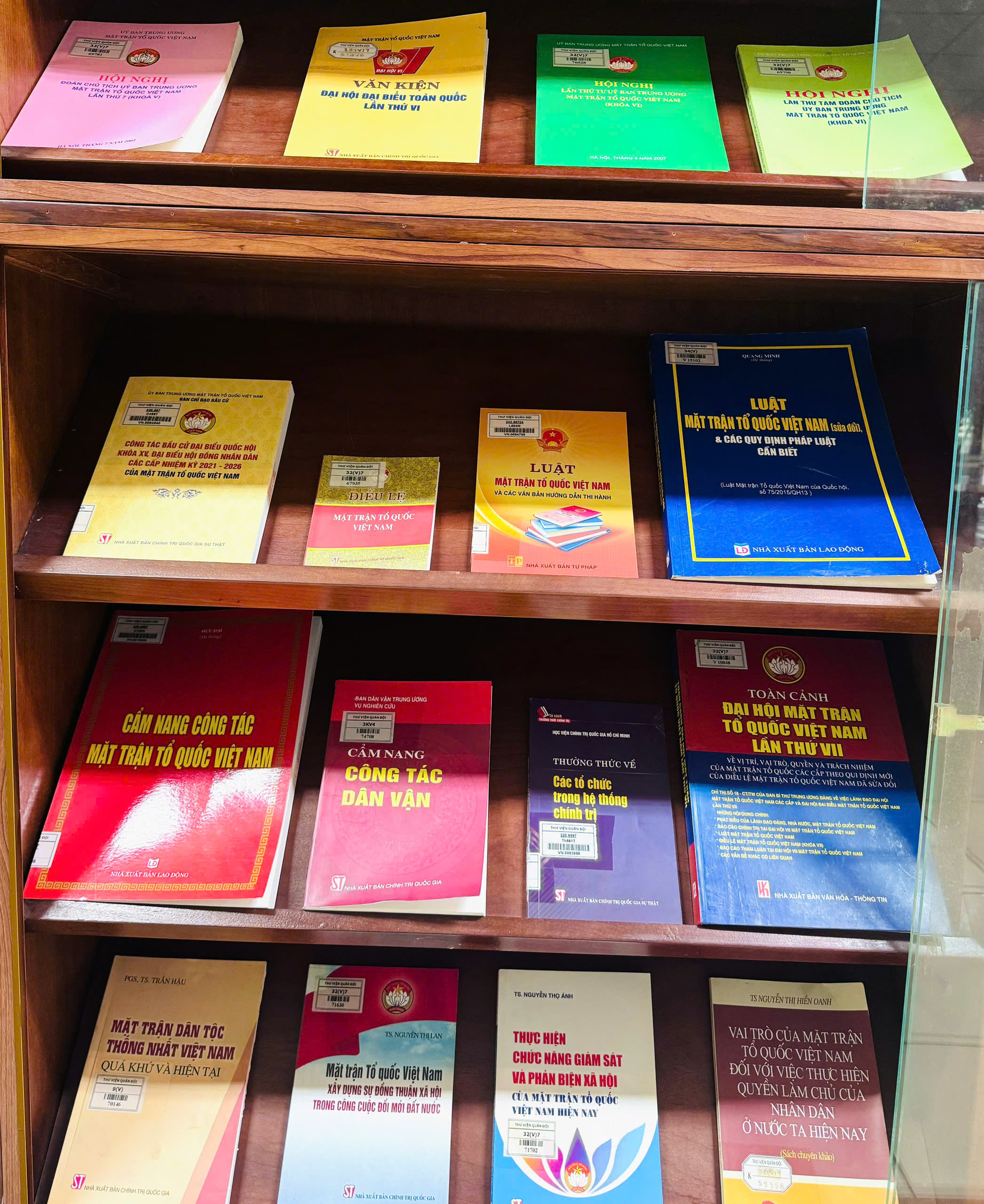 Trưng bày giới thiệu hơn 100 đầu sách và tài liệu tiêu biểu phản ánh quá trình hình thành, phát triển và những đóng góp quan trọng của Mặt trận Tổ quốc Việt Nam trong sự nghiệp cách mạng của dân tộc. Các tài liệu tập trung vào những nội dung trọng tâm như: Tư tưởng của Chủ tịch Hồ Chí Minh và các đồng chí lãnh đạo Đảng, Nhà nước về công tác Mặt trận và đại đoàn kết toàn dân tộc; hệ thống hội nghị, văn bản, nghị quyết qua các thời kỳ khẳng định đường lối, phương hướng, nhiệm vụ của công tác Mặt trận; Luật Mặt trận Tổ quốc Việt Nam và các văn bản quy định liên quan; các công trình nghiên cứu, phân tích về vai trò lịch sử của Mặt trận Tổ quốc Việt Nam trong các giai đoạn đấu tranh giải phóng dân tộc, xây dựng và bảo vệ Tổ quốc; cùng nhiều tấm gương tiêu biểu trong phong trào đại đoàn kết toàn dân tộc.