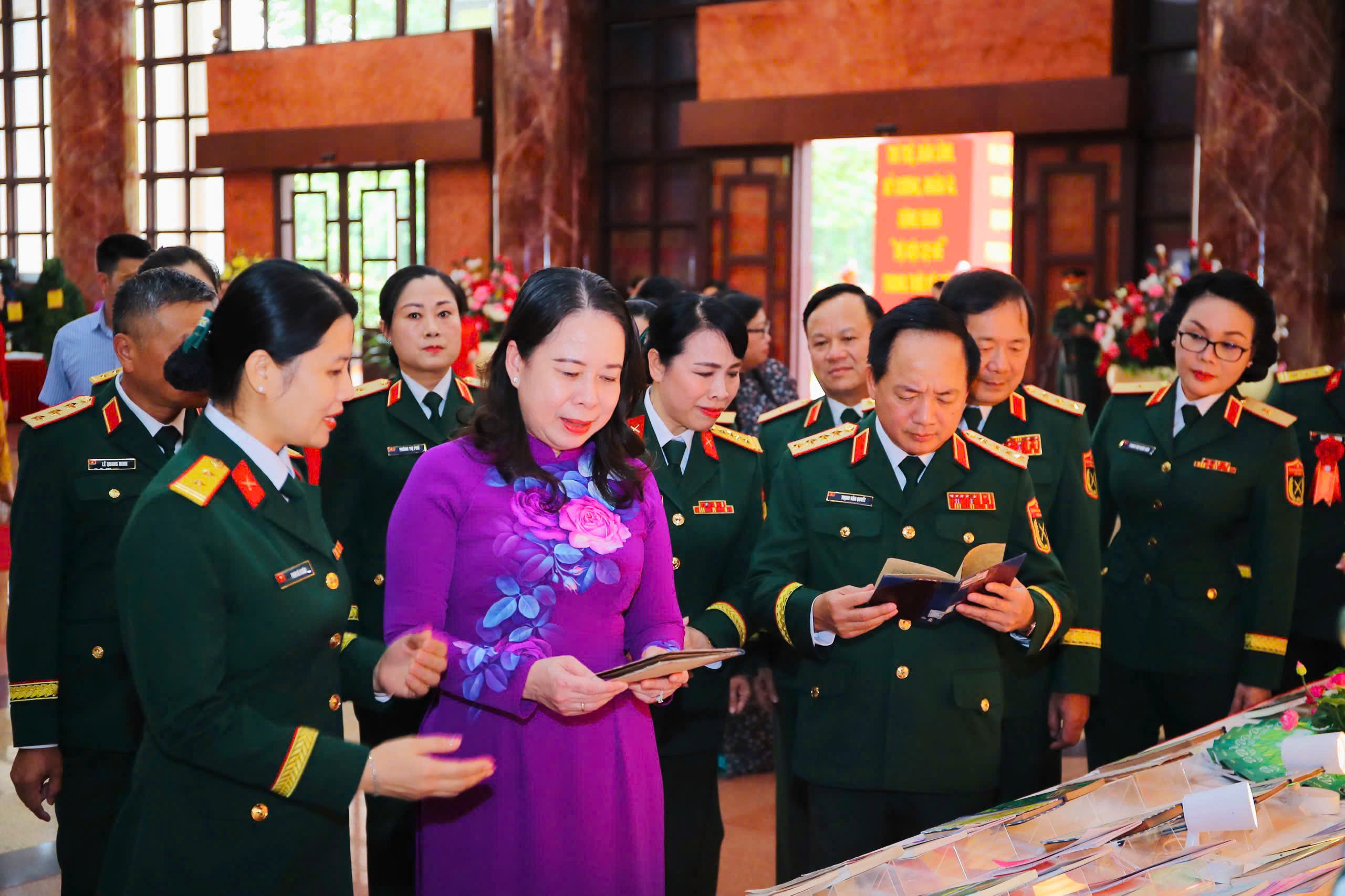 Đại tướng Trịnh Văn Quyết, Bí thư Trung ương Đảng, Ủy viên Thường vụ Quân ủy Trung ương, Chủ nhiệm Tổng cục Chính trị QĐND Việt Nam; Phó Chủ tịch nước Võ Thị Ánh Xuân, Ủy viên Trung ương Đảng và các đại biểu tham quan khu trưng bày sách của TVQĐ.