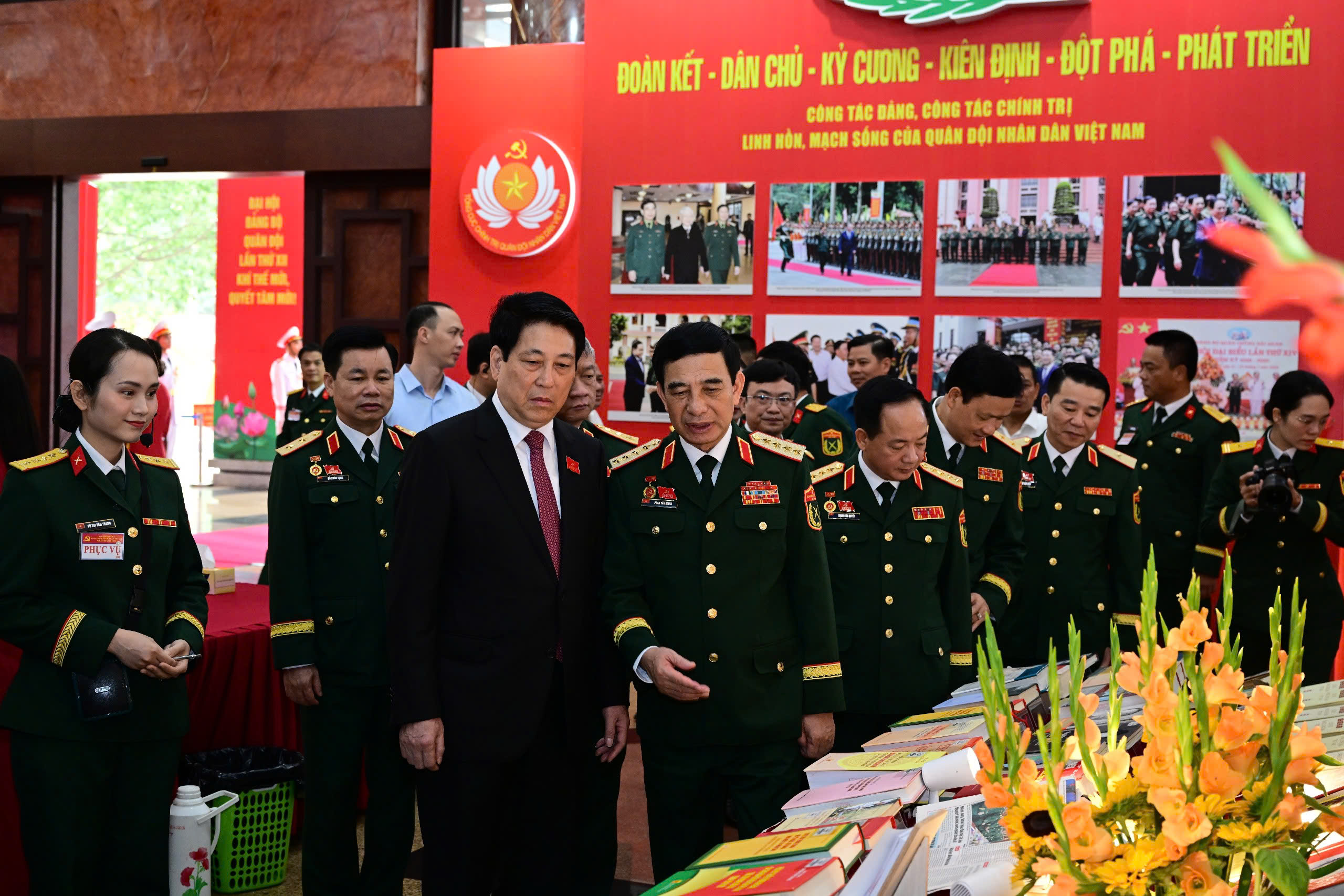 Chủ tịch nước Lương Cường, Ủy viên Bộ Chính trị, Ủy viên Thường vụ Quân ủy Trung ương và các đại biểu tham quan khu trưng bày sách của TVQĐ tại đại hội.