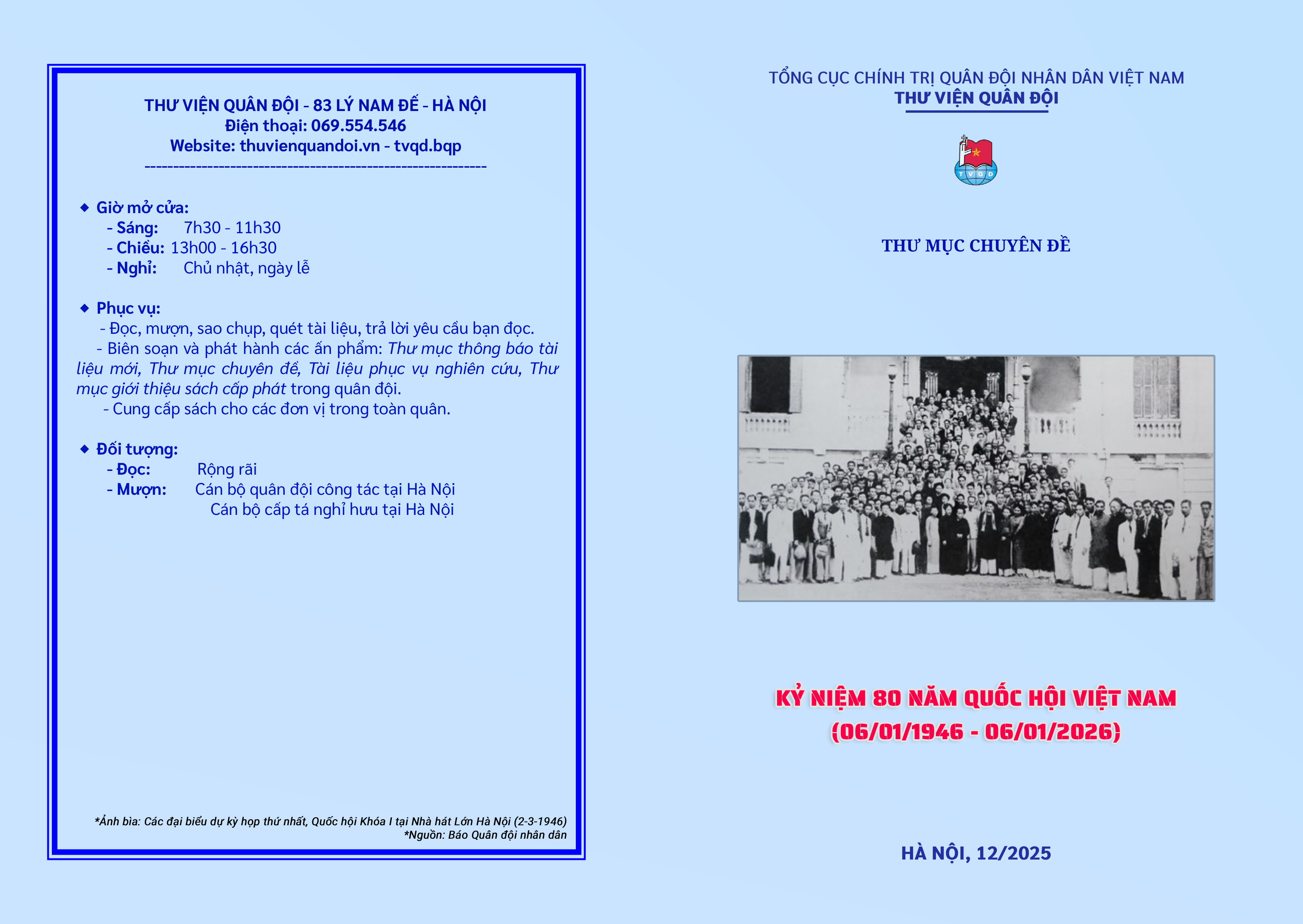 Nhân dịp kỷ niệm 80 năm Ngày Tổng tuyển cử đầu tiên bầu ra Quốc hội khóa I nước Việt Nam Dân chủ Cộng hòa, nay là nước Cộng hòa xã hội chủ nghĩa Việt Nam (06/01/1946 - 06/01/2026), Thư viện Quân đội biên soạn Thư mục chuyên đề “Kỷ niệm 80 năm Quốc hội Việt Nam (1946-2026)” nhằm tuyên truyền, giới thiệu những tài liệu quý về sự kiện lịch sử này đang được lưu trữ tại Thư viện Quân đội.